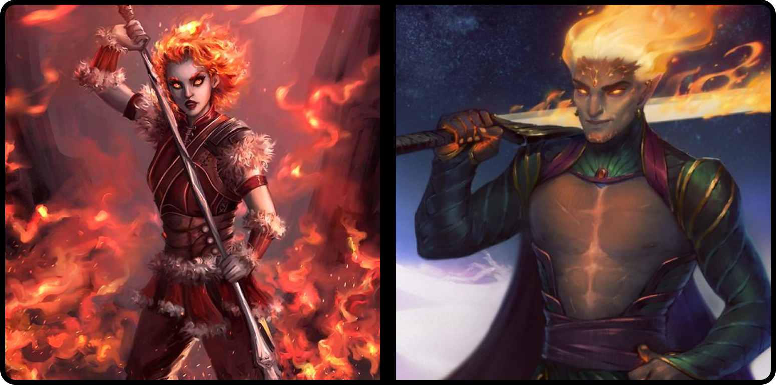 Fire primordials channel the flamboyant and often destructive nature of flame. They show their heritage in their skin tones, which can range from deep charcoal to shades of red and orange. Some bear skin tones common to humanity but with fiery marks, such as slowly swirling lights under their skin that resemble embers or glowing red lines tracing over their bodies like cracks. Fire primordial hair can resemble threads of fire or sooty smoke.